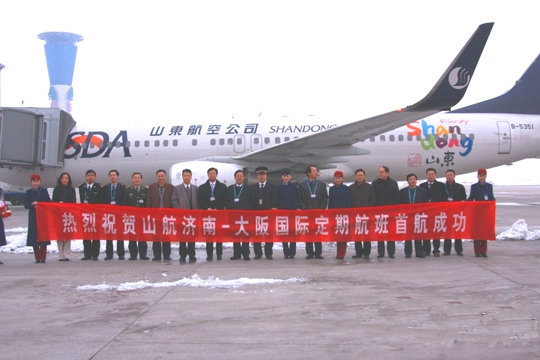 民航资源网2010年3月2日消息:3月2日08:05(北京时间),山东航空股份有限公司(Shandong Airlines Co., Ltd.,简称“山航”)SC4093航班由济南遥墙国际机场起飞,11:35(日本时间)降落于大阪,山航济南——大阪定期航班首航圆满成功。